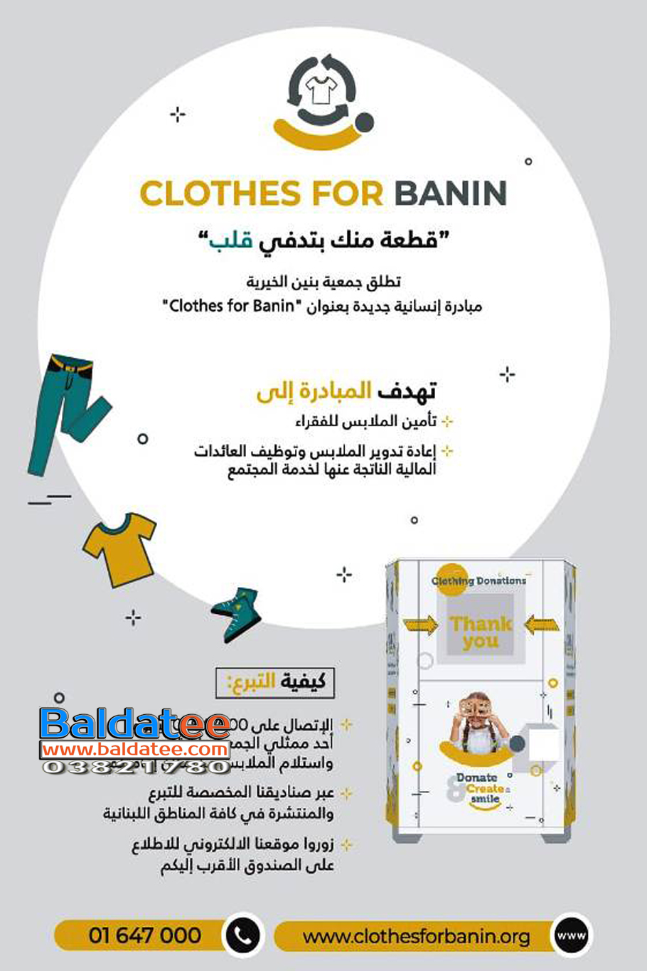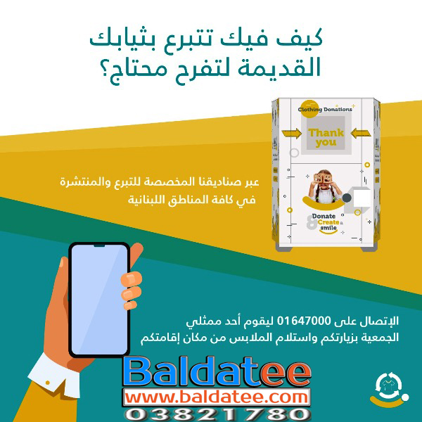 تحت عنوان “قطعة منك بتدفي قلب” قامت جمعية بنين الخيرية وبالتعاون مع العديد من البلديات بزرع صناديق تبرعات ضخمة للثياب المستعملة بغية الإستفادة منها بعد توضيبها لتوزيعها على العائلات الأكثر حاجة وقد وزعت الصناديق على أعداد معينة بحسب كل منطقة نذكر بعض المناطق التي وضعت فيها هذه الصناديق : صور _ العباسية _ برج رحال _ جناتا _ أرزون _ شحور … وستستكمل عملية التوزيع على باقي المناطق في الجنوب تباعا . كما وتدعو جمعية بنين كل من يريد التبرع أن يقوم بوضع تبرعاته من ملابس في هذه الصناديق المخصصة لذلك او التواصل على الرقم التالي : 81313054 .. كما وإنّ جمعية بنين الخيرية تشكر البلديات التي تم التواصل معها والتي سيتم التواصل معها لاحقا على حسن تعاونها معنا على أمل أن تصل صناديق التبرعات الى كل منطقة في لبنان إن شاء الله .