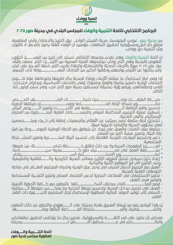أطلقت اللجنة الإنتخابية في مدينة صور لائحة التنمية والوفاء للمجلس البلدي في المدينة، وذلك خلال مؤتمر صحفي أقيم في استراحة صور السياحية، بحضور النواب السادة عناية عز الدين، علي خريس وحسن عز الدين، رئيس اللجنة الانتخابية لحركة أمل في إقليم جبل عامل المسؤول التنظيمي للإقليم المهندس علي اسماعيل وأعضاء قيادة الإقليم ، مسؤول مكتب الشؤون البلدية والاختيارية في حركة أمل اقليم جبل عامل محمد حرقوص، مسؤول العمل البلدي في منطقة جبل عامل الأولى في حزب الله علي الزين، اللجان الانتخابية في الاقليم والمنطقة الاولى وشعبة مدينة صور في حركة أمل وحزب الله، أعضاء البلدية الحالية، المرشحين على اللائحة واعلاميين.