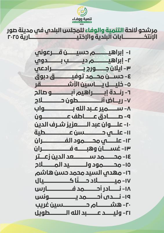 ثم أعلن شرف الدين عن أسماء المرشحين للمجلس البلدي في مدينة صور ضمن لائحة التنمية والوفاء وهم: