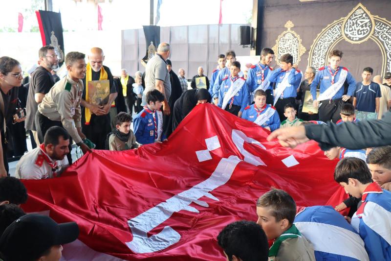 وبعد آيات من القرآن الكريم، دخلت الراية في موكب خاص، تقدمته فرقة من كشافة الإمام المهدي حملت صور القادة والشهداء وصورة الشهيد السيد صفي الدين، ثم نشرت فوق الضريح المبارك، فيما ألقى الشيخ الخزاعي كلمة باسم العتبة الحسينية قال فيها أننا جئنا اليوم من كربلاء المقدسة إلى هذا المكان لنرفع راية الإمام الحسين (ع) التي تشرفت وتقدست باسمه الشريف على ضريح الشهيد المجاهد السيد هاشم صفي الدين، الذين لم يترك ميدان المنازلة وساحات الجهاد ضد العدو الصهيوني.
