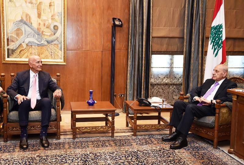 إستقبل رئيس مجلس النواب نبيه بري في مقر الرئاسة الثانية في عين التينة الموفد الامريكي توماس براك ونائبة المبعوث الامريكي للشرق الاوسط مورغان أورتاغوس والوفد المرافق لهما بحضور السفيرة الاميركية في لبنان ليزا جونسون والمستشار الإعلامي لرئيس مجلس النواب علي حمدان ، حيث تناول اللقاء الذي إستمر لأكثر من ساعة التطورات والمستجدات السياسية والميدانية في لبنان والمنطقة .
